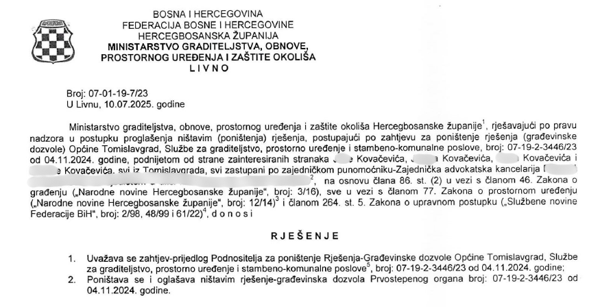 “Ovim se oglašava ništavnom građevinska dozvola broj 07-19-3-1871-23 od 25.11.2024. godine…”, jasno stoji u rješenju Ministarstva koje posjeduje Hercegovina.info.