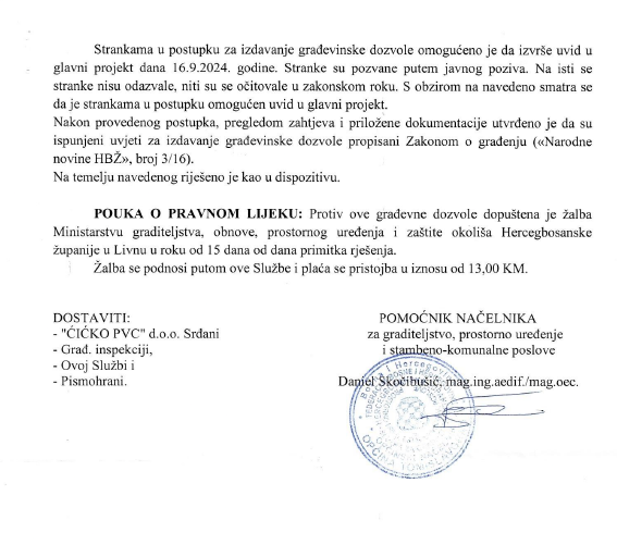 Ovo rješenje je konačno u upravnom postupku, a eventualno se može pobijati tužbom pred nadležnim sudom u zakonskom roku.
