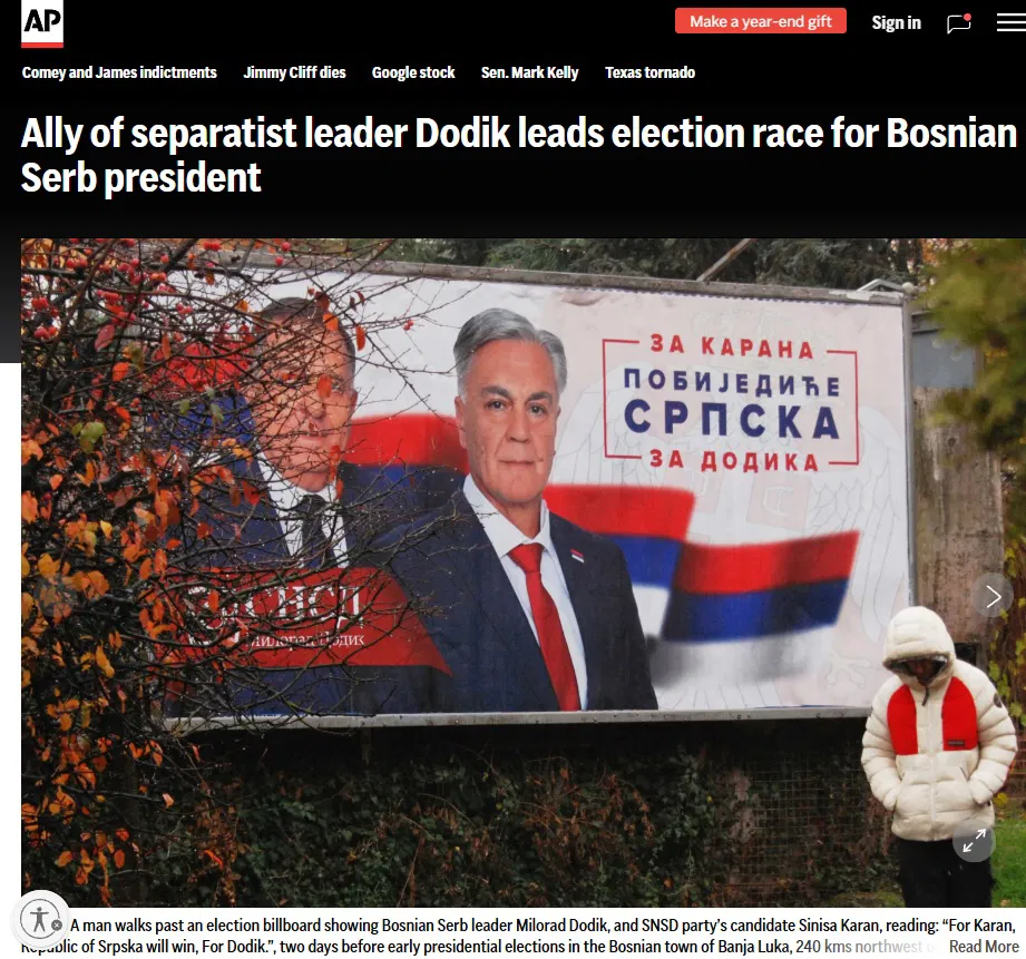 Associated Pressu (AP) dan nakon izbora u svom izvještaju izvukao naslov “Saradnik lidera separatista Dodika vodu u izbornoj utrci za predsjednika bosanskih Srba”.
