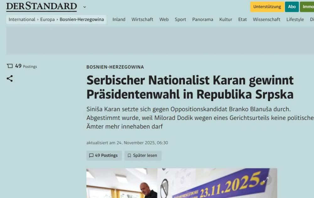 Austrijski Der Standard postarao se i da i Sinišu Karana etiketira jednako kao Dodika pa je svom izvještaju dao naslov “Srpski nacionalista Karan pobijedio je na izborima u RS”, dok je austrijski Die Presse naslov dodatno “začinio”, pa je glasio “SNSD: Srpski separatisti pobijedili na izborima u Bosni”.