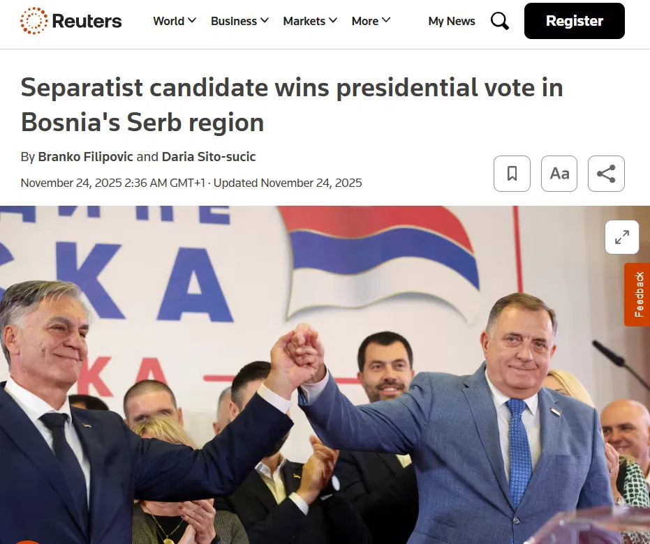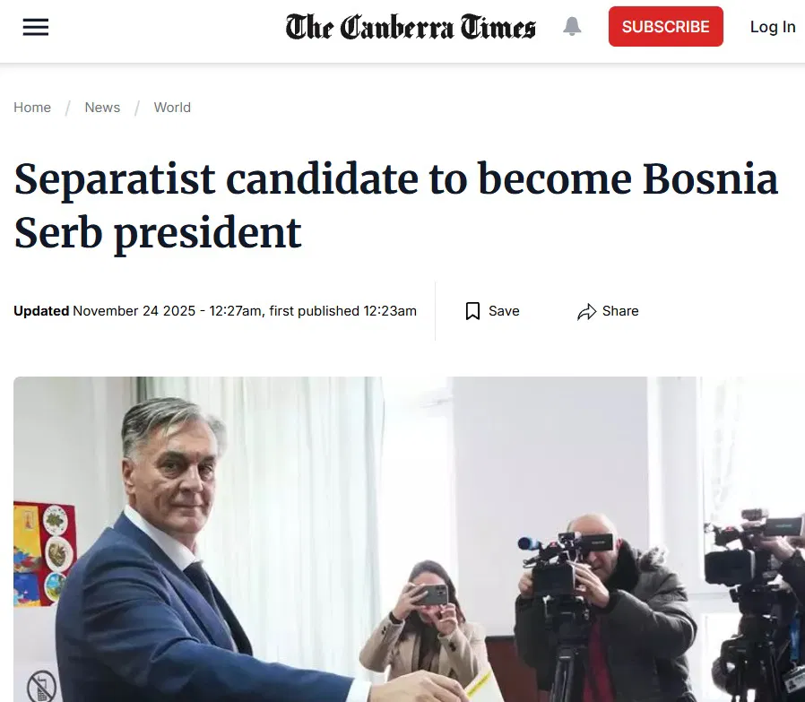 Na drugom kraju planete, u Australiji, The Canberra Times izvukao je naslov “Separatistički kandidat postat će predsjednik Srba u Bosni”, dok je francuski France24 išao korak dalje te objavio izvještaj s naslovom “Stranka banovanog lidera bosanskih Srba Dodika pobjeđuje na prijevremenim predsjedničkim izborima”.