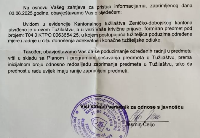 Postupajuća tužiteljica poduzima određene mjere i radnje u cilju donošenja adekvatne i konačne tužilačke odluke, stoji u odgovoru Tužilaštva ZDK upućenog NG “Kakanj ustaje”.