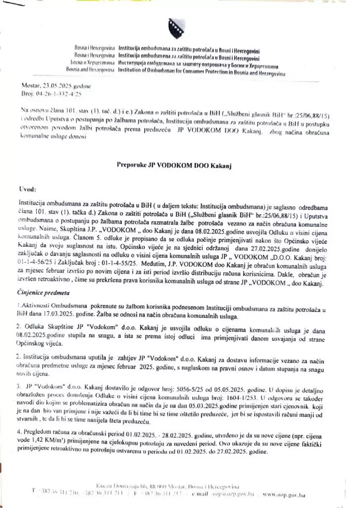 “Institucija ombudsmana im je dala rok od osam dana da se izjasne. JP Vodokom se izjasnio, dosta nejasno. Naveli su da nisu mogli umanjiti račune i da je preduzeće u finansijskog krizi. Dakle, zanemaruju to što su oštetili građen već gledaju samo svoj interes. Ombudsman to nije prihvatio te im je poslao novu preporuku u kojoj se kaže da je ovo preduzeće prekršilo nekoliko zakona i dao im je rok od 30 dana da vrate ono što su od građana više naplatili. Ukoliko to ne urade, ombudsman navodi da će on poduzeti ono što je u njegovoj nadležnosti”, ističe Topalović.