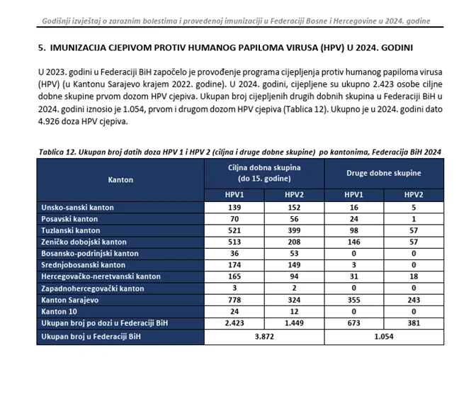 Prema Godišnjem izvještaju o zaraznim bolestima i provedenoj imunizaciji Federacije BiH za 2024. najmanji broj doza HPV vakcina dat je u Zapadno-hercegovačkom kantonu, svega tri za prvu dozu i dvije za drugu dozu: