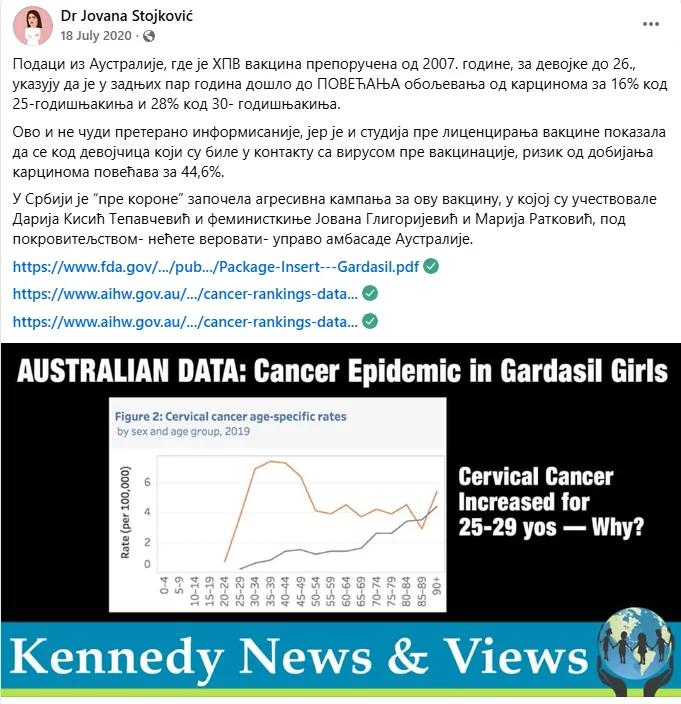 U Srbiji, psihijatrica dr Jovana Stojković, koja je glasni protivnik vakcinacije u širem rasponu i pripadnica desničarskog pokreta „Živim za Srbiju“ koji promiče tradicionalne vrijednosti, pogotovo tradicionalnu porodicu, i protivi se pravima LGBTIQ osoba, širila je netačna mišljenja o neefikasnosti HPV vakcina, istovremeno stavljajući mete na čelo nekolicini feministkinja, poput Marije Ratković: