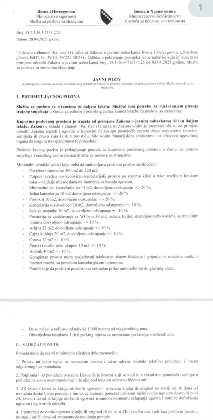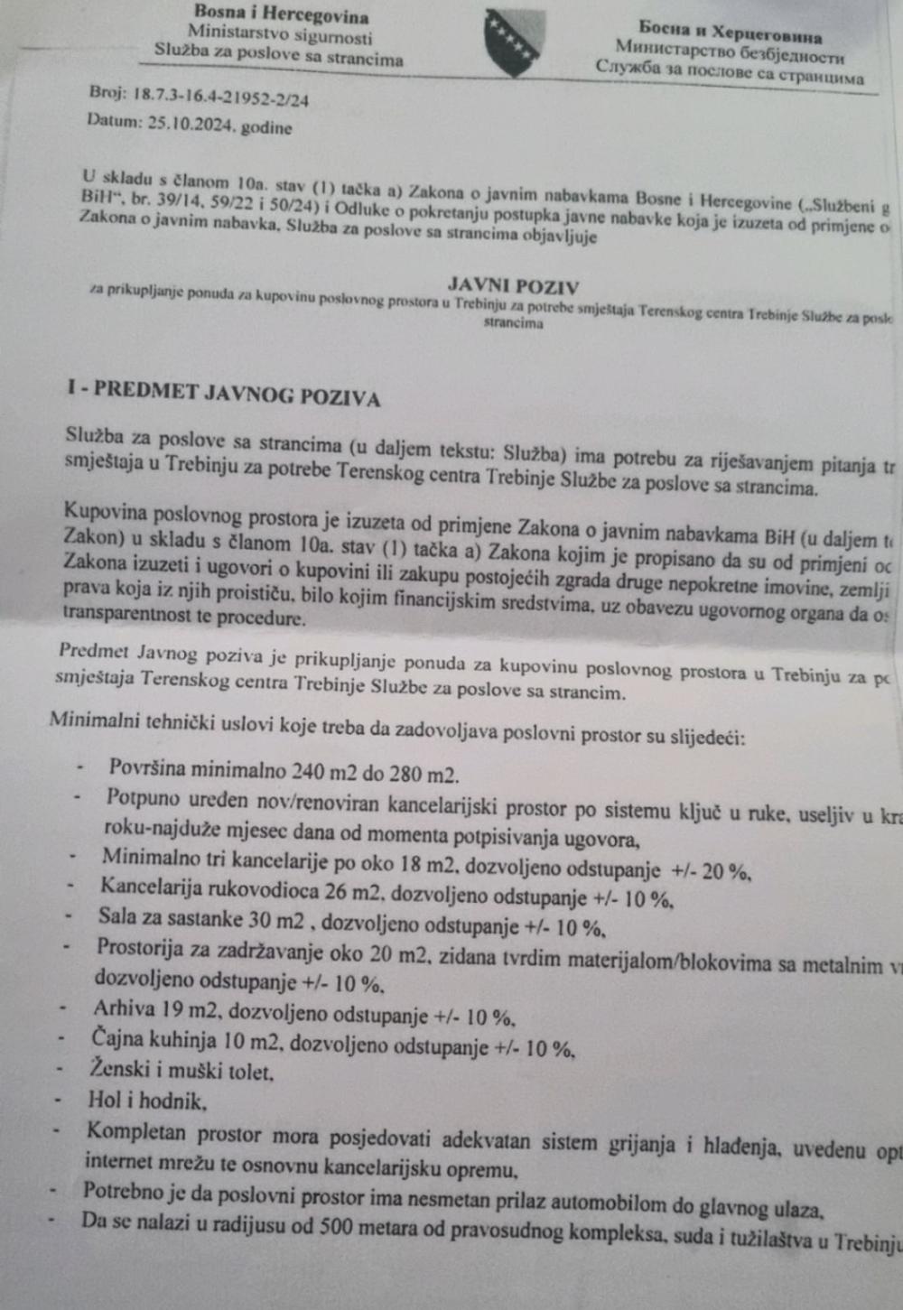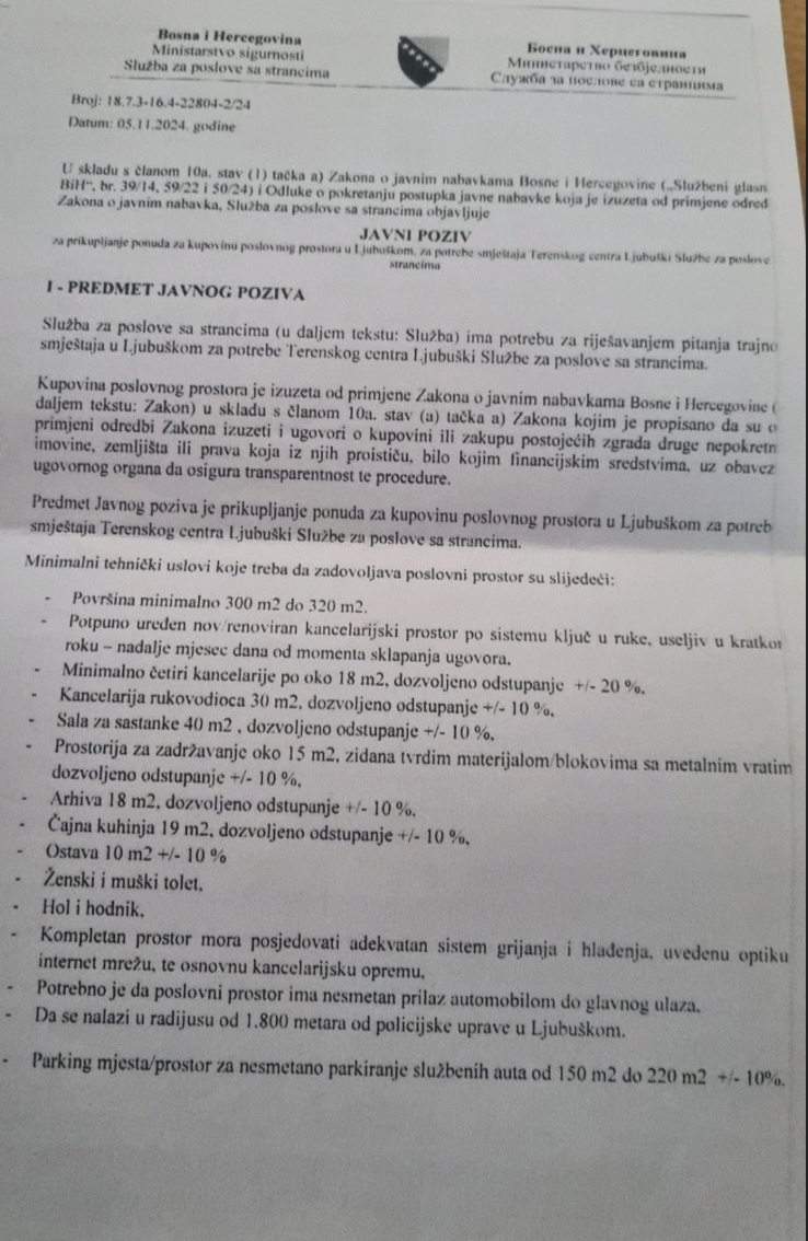 U javnom pozivu za kupovinu poslovnog prostora za smještaj terenske jedinice Službe za poslove sa strancima u Trebinju taksativno je navedeno da su minimalni tehnički uslovi koje treba da zadovoljava poslovni prostor površina od 240 do 280 kvadrata, da prostor bude potpuno uređen nov ili renoviran, da se nalazi u radijusu od 500 metara od pravosudnog kompleksa u Trebinju, uz navedene tačne kvadrature svih prostorija, uz određena odstupanja.