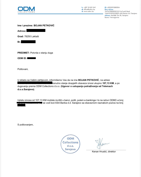 “Iako sam tražio jasnu specifikaciju računa, poslali su mi potvrdu o dugu bez ijednog datuma. Tu se vidi da su namjerno pokušavali sakriti potraživanje starije od godinu dana, kada pada u zastaru. Odgovorio sam pismeno i onda su me neko vrijeme ignorisali, ali su onda pozivi ponovo počeli. Nikada nisam dobio nikakvo zvanično pismeno obavještenje od “Telemacha” da je moj predmet predat njima, pa mi je ovo sve prilično zbunjujuće. Ne mogu uplaćivati novac “na neviđeno” i samo na osnovu telefonskog poziva, a dokaze o mom dugovanju još nisam dobio“, kaže Petković, koji nam je u razgovoru rekao da su ga i prije dva dana zvali iz ove firme.