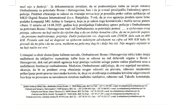 Obratila se i Ombudsmanu za ljudska prava BiH, odakle joj je odgovoreno da institucija nije nadležna, ali da bi se, prema dostupnim informacijama, moglo raditi o krivičnim djelima prevare, zloupotrebe ličnih podataka i pribavljanja protivpravne imovinske koristi.