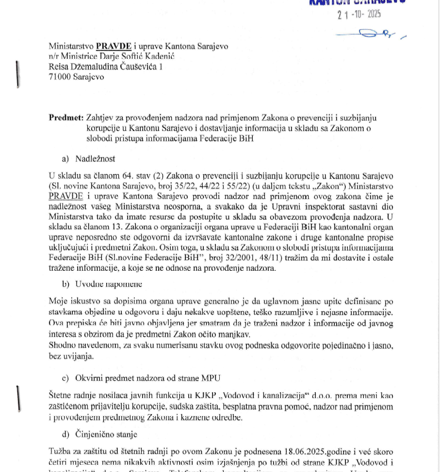 – Status zaštićenog prijavitelja korupcije me nije spasio od nezakonitog otkaza, Kantonalna uprava za inspekcijske poslove utvrdila da je otkaz ugovora o radu nezakonit i izrekla prekršajne mjere. Međutim, ni danas ne može da naloži poslodavcu da me vrati na posao zbog toga. Podnesena je tužba 18. juna 2025. po osnovu Zakona o prevenciji i suzbijanju korupcije u Kantonu Sarajevo radi eksterne zaštite od štetnih radnji koje sam trpio i trpim i dalje u smislu otkaza ugovora o radu – ističe Nuhbegović.