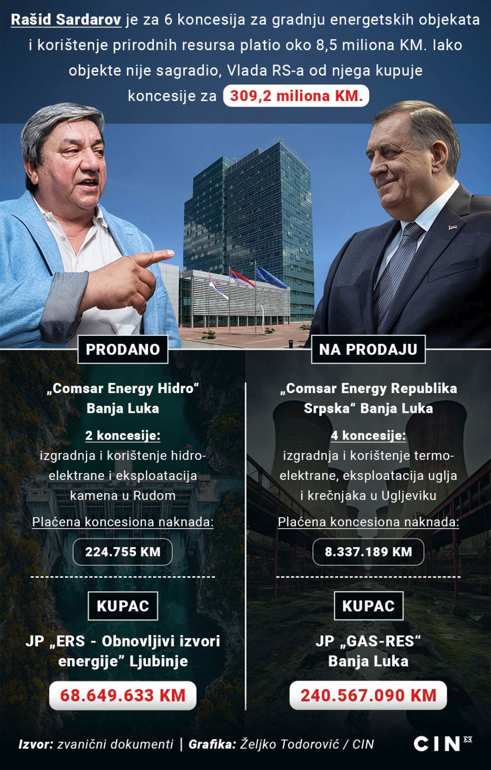 Vlada RS-a je dodijelila Rusu Rašidu Sardarovu koncesije za gradnju i korištenje energetskih objekata, uz naknade od oko 8,5 miliona KM. Desetak godina kasnije, objekte nije izgradio, a Vlada je spremna od njega otkupiti koncesije za 309,2 miliona KM.