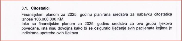 U finansijskom izvještaju Fonda soidarnosti za 2025. godinu navedeno je da planirana sredstva za kupovinu citostatika nisu dovoljna da se osigura liječenje svih pacijenata.