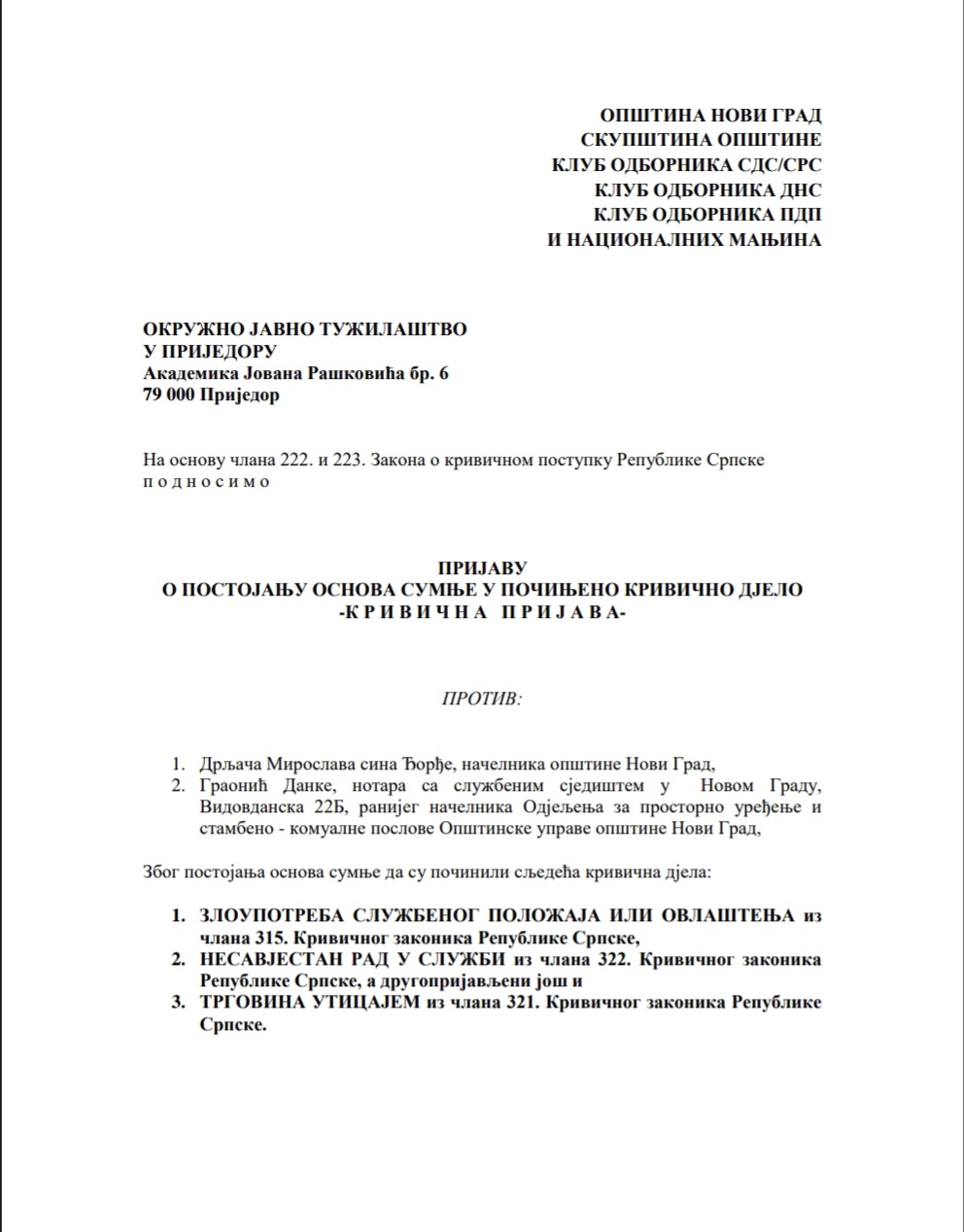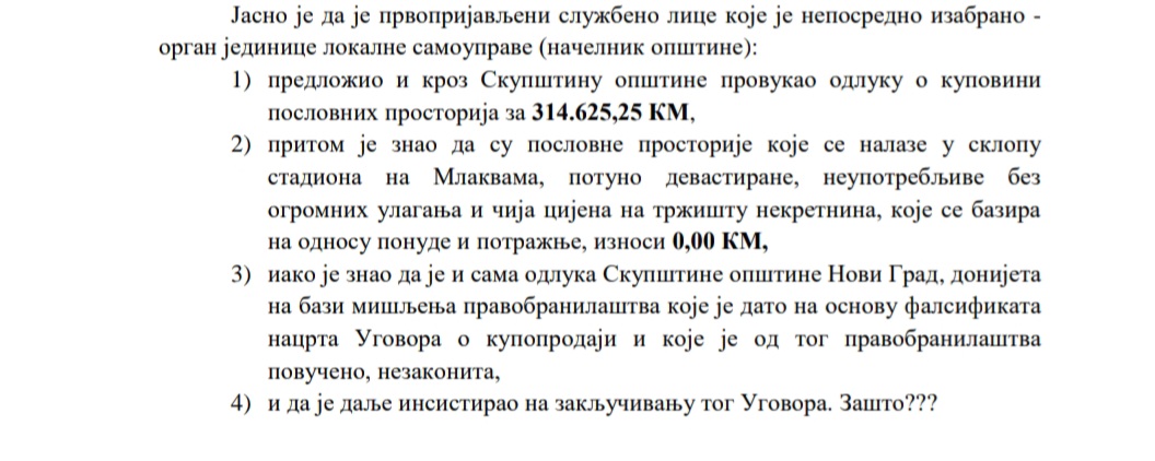 “Da apsurd i kriminal bude veći notarsku obradu Ugovora o kupoprodaji je vršila drugoprijavljena! Dakle, Ugovor o kupoprodaji je notarski obradila osoba koja je osumnjičena da je ranije falsifikovala nacrt tog istog ugovora pod memorandumom notarke J.Đ. iz Prijedora“, navodi se u krivičnoj prijavi koja je podnesena Okružnom javnom tužilaštvu u Prijedoru.