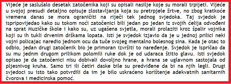 „Vijeće zaključuje da su zarobljenici u Muzičkoj školi, koji nisu aktivno učestvovali u neprijateljstvima, bili žrtve okrutnog postupanja koje su pripadnici 7. brigade vršili od 26. januara 1993. do 20. augusta 1993. ili 20 septembra 1993., i to u vidu fizičkog i duševnog zlostavljanja, te od mjeseca aprila do juna 1993., u vidu uslova zatočenja…Vijeće se van svake razumne sumnje uvjerilo da je optuženi Hadžihasanović imao na raspolaganju alarmantne informacije o tome da njegovi potčinjeni u Muzičkoj školi u Zenici nad zatočenicima vrše fizičko i duševno nasilje koje predstavlja okrutno postupanje“, navedeno je u prvostepenoj presudi 2006. godine.