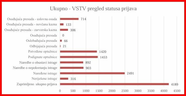 Prema podacima VSTV-a dostavljenim Instituciji ombudsmena, u navedenom periodu, dakle za 18 mjeseci, primljeno je 4.189 prijava za nasilje u prodici/porodičnoj zajednici. Neriješeno je 316 istraga, naređeno 2.491 istraga a u 903 slučaja donesena je naredba o neprovođenju istrage. Istraga je obustavljena u 892 slučaja.