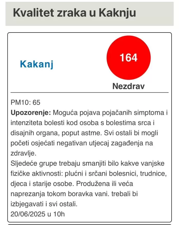 Kakanj je godinama među najzagađenijim gradovima u Bosni i Hercegivini što potvrđuju i zvanični podaci o indeksu kvalitete zraka koji se svakodnevno nalazi u crvenoj zoni – označenoj kao nezdrava.