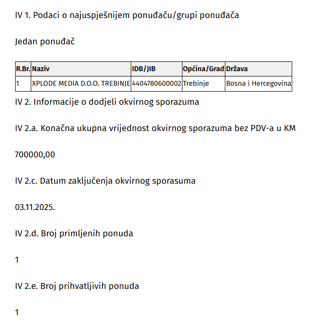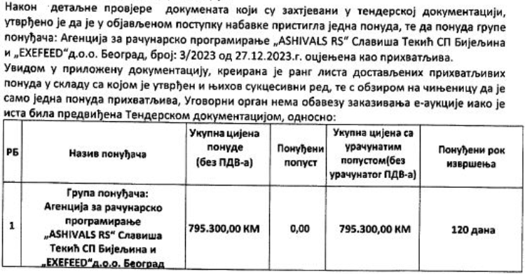Podsjetimo, ugovor o nabavci softvera za upravljanje javnim nabavkama ugovornih organa za potrebe MH Elektroprivrede RS potpisan je krajem januara 2024. godine. Zanimljiva je činjenica da je tada na tender pristigla samo jedna ponuda. Agencija za računarsko programiranje Ashivals RS u vlasništvu Slaviše Tekića s firmom Exefeed d.o.o iz Beograda je dostavila ponudu samo 50 KM nižu od procijenjene vrijednosti.