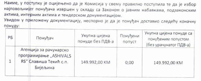 U decembru prošle godine Elektroprivreda Republike Srpske je za nabavku usluga održavanja softvera Ashivals izdvojila za upravljanje javnim nabavkama 150 000 KM. Pregovaračkim postupkom bez objave obavještenja o nabavci ugovor je dodijeljen Agenciji za računarsko programiranje Ashivals RS u vlasništvu Slaviše Tekića. Ponuda ove firme iznosila je osam KM manje od procijenjene vrijednosti nabavke.