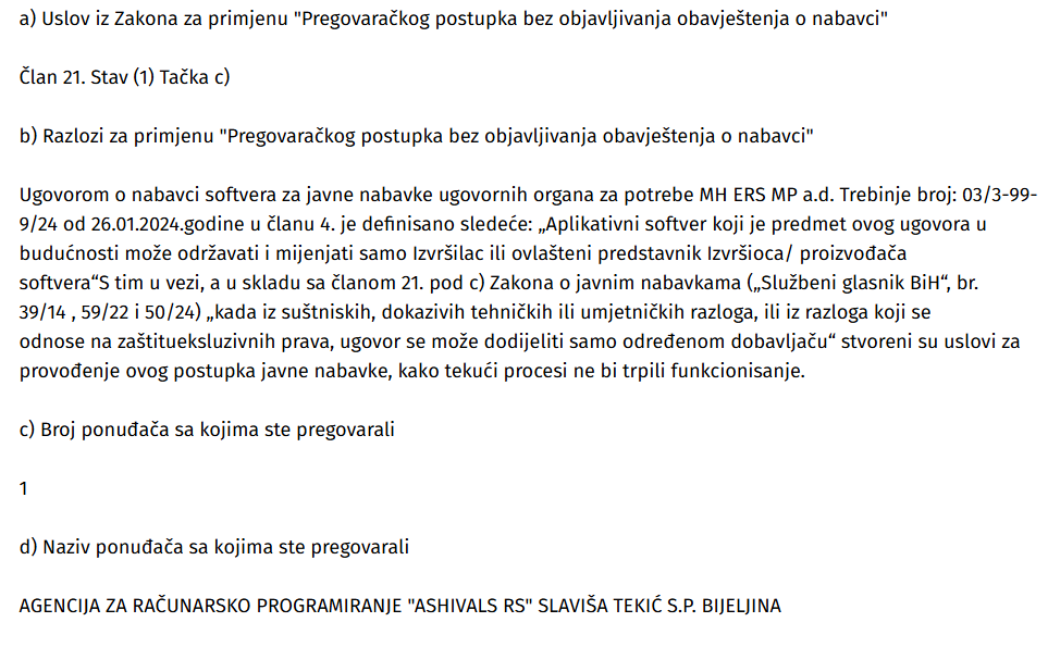 “Ugovorom o nabavci softvera za javne nabavke ugovornih organa za potrebe MH ERS MP a.d. Trebinje broj: 03/3-99- 9/24 od 26.01.2024.godine u članu 4. je definisano sljedeće: „Aplikativni softver koji je predmet ovog ugovora može održavati i mijenjati samo izvršilac ili ovlašteni predstavnik izvršioca/ proizvođača softvera“, naveli su iz Elektroprivrede RS u obrazloženju razloga za pokretanje pregovaračkog postupka.