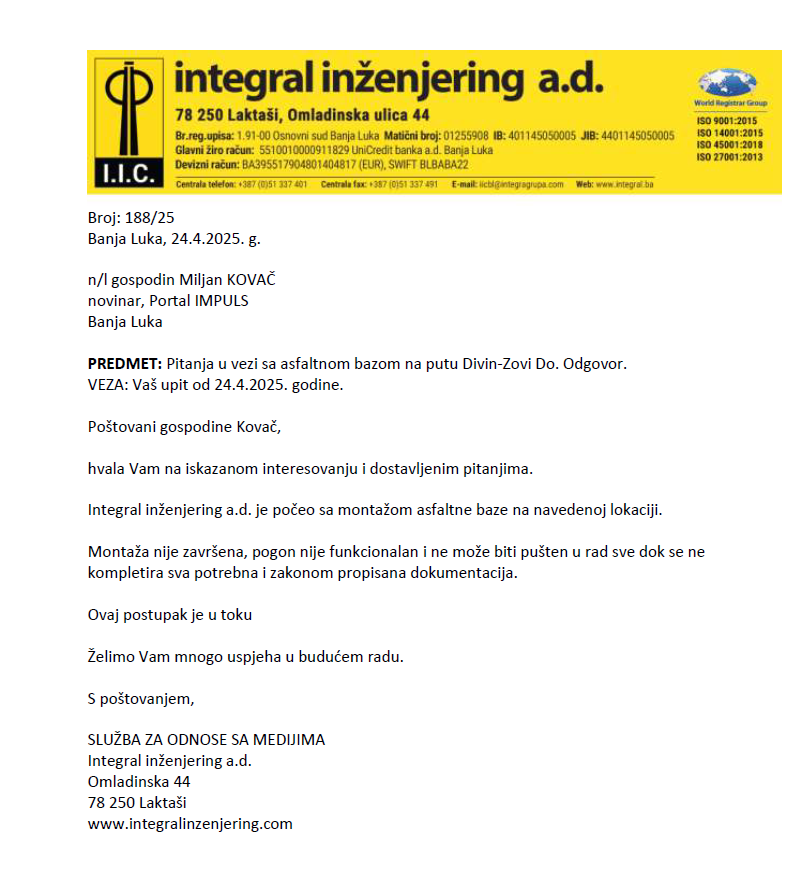“Integral inženjering a.d. je počeo sa montažom asfaltne baze na navedenoj lokaciji. Montaža nije završena, pogon nije funkcionalan i ne može biti pušten u rad sve dok se ne kompletira sva potrebna i zakonom propisana dokumentacija.