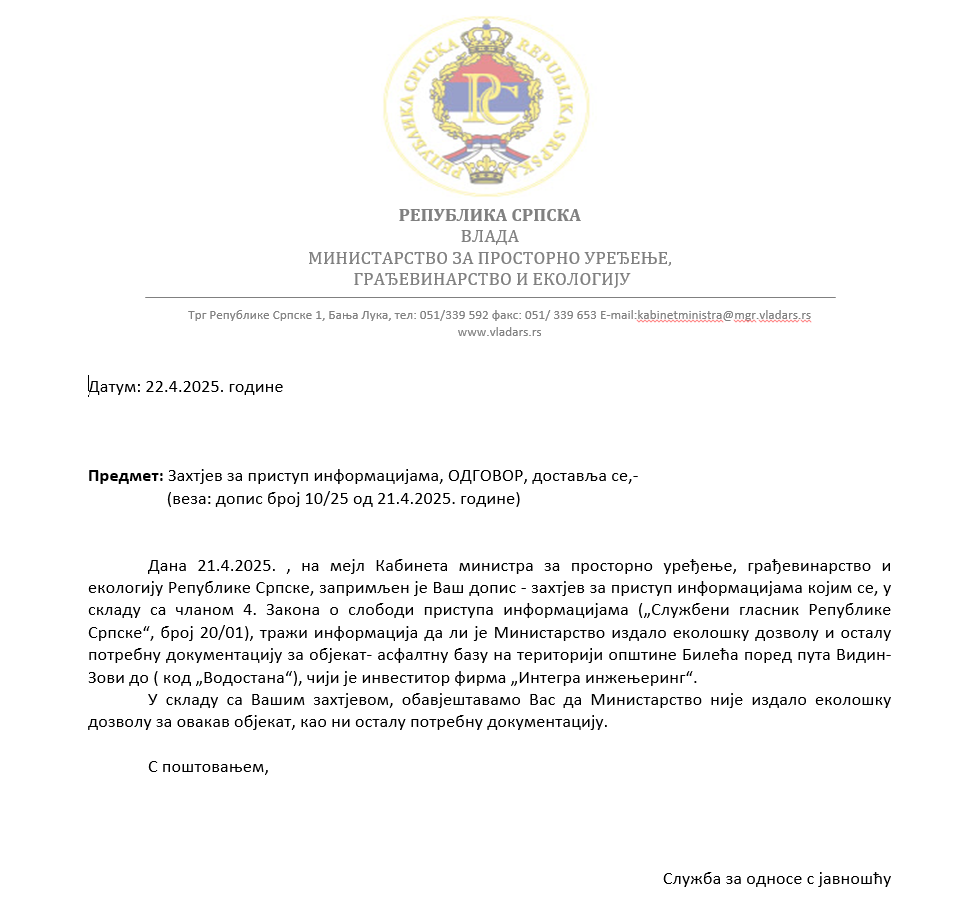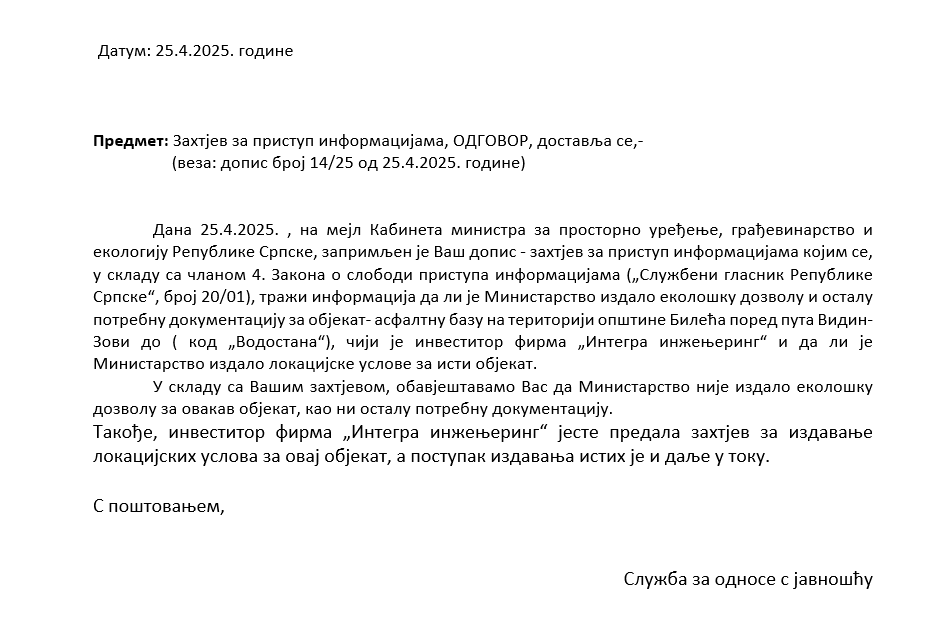 Nakon što smo od zaposlenih na licu mjesta čuli da asfaltnu bazu montira firma “Integra inženjering” iz Banjaluke, obratili smo se ovoj firmi, Ministarstvu za prostorno uređenje urbanizam i ekologiju i opštini Bileća.