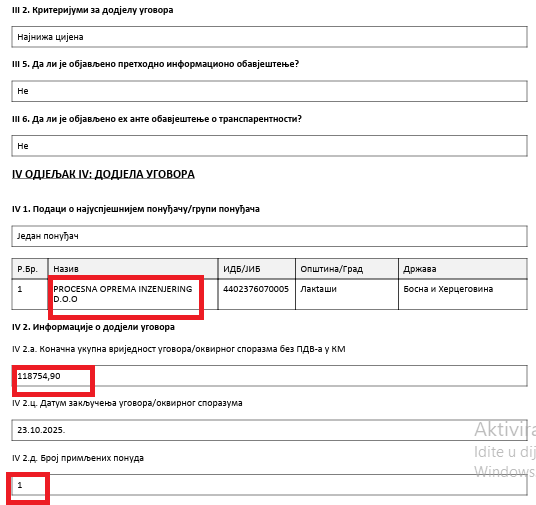 Ova firma je jedina dostavila ponudu za pomenutu javnu nabavku, što je vidljivo iz obavještenja o dodjeli ugovora, koji je na portalu javnih nabavki objavljen 16. aprila 2024. godine.