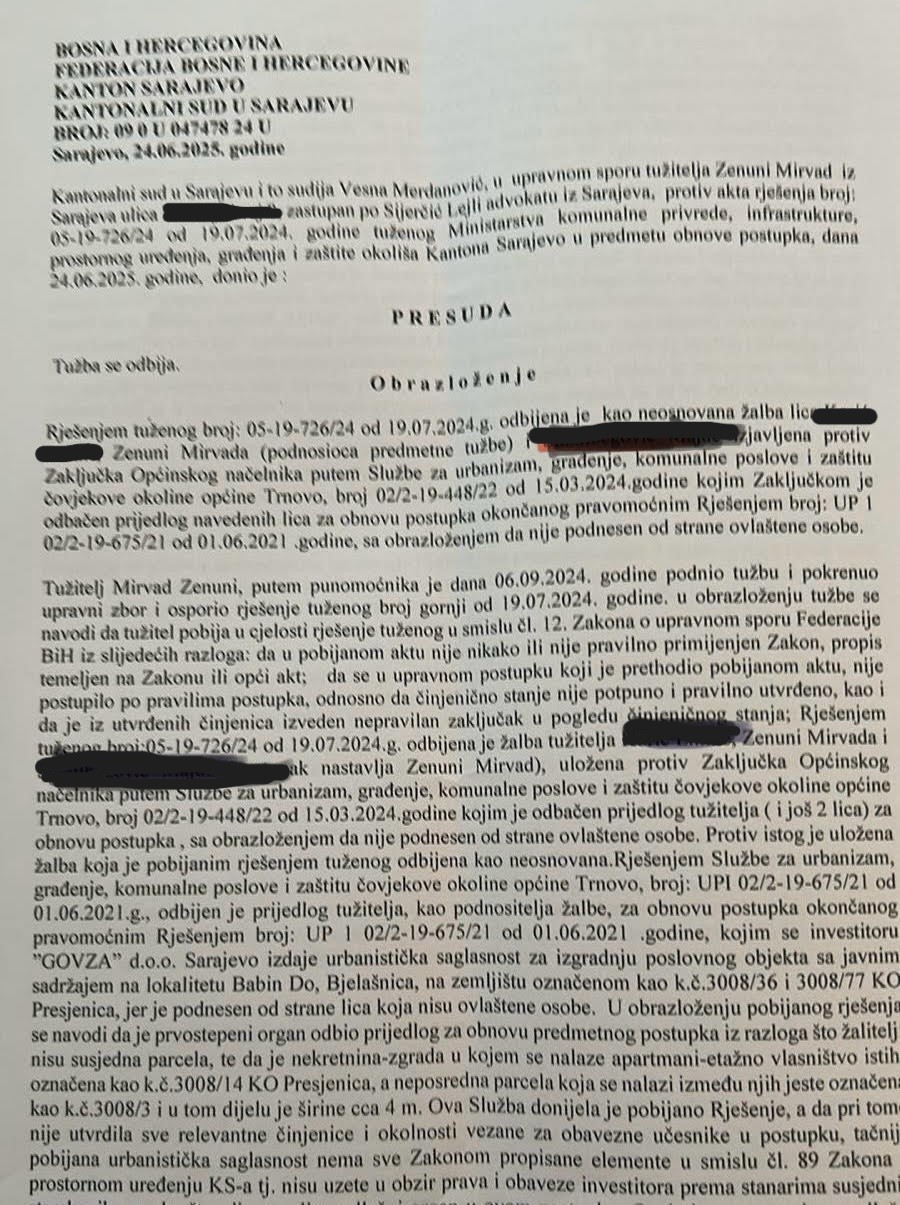 Jedan od konkretnih slučajeva koji ilustruje ovaj urbanistički haos jeste i presuda Kantonalnog suda u Sarajevu od 24. juna 2025. godine, kojom je odbijena tužba Mirvada Zenunija, vlasnika apartmana na Bjelašnici. Zenuni je pokušao osporiti urbanističku saglasnost koju je Općina Trnovo izdala firmi Govza za gradnju stambeno-poslovnog objekta na Babinom dolu, tvrdeći da su etažni vlasnici iz susjedne zgrade nezakonito isključeni iz postupka jer nisu prepoznati kao stranke.
