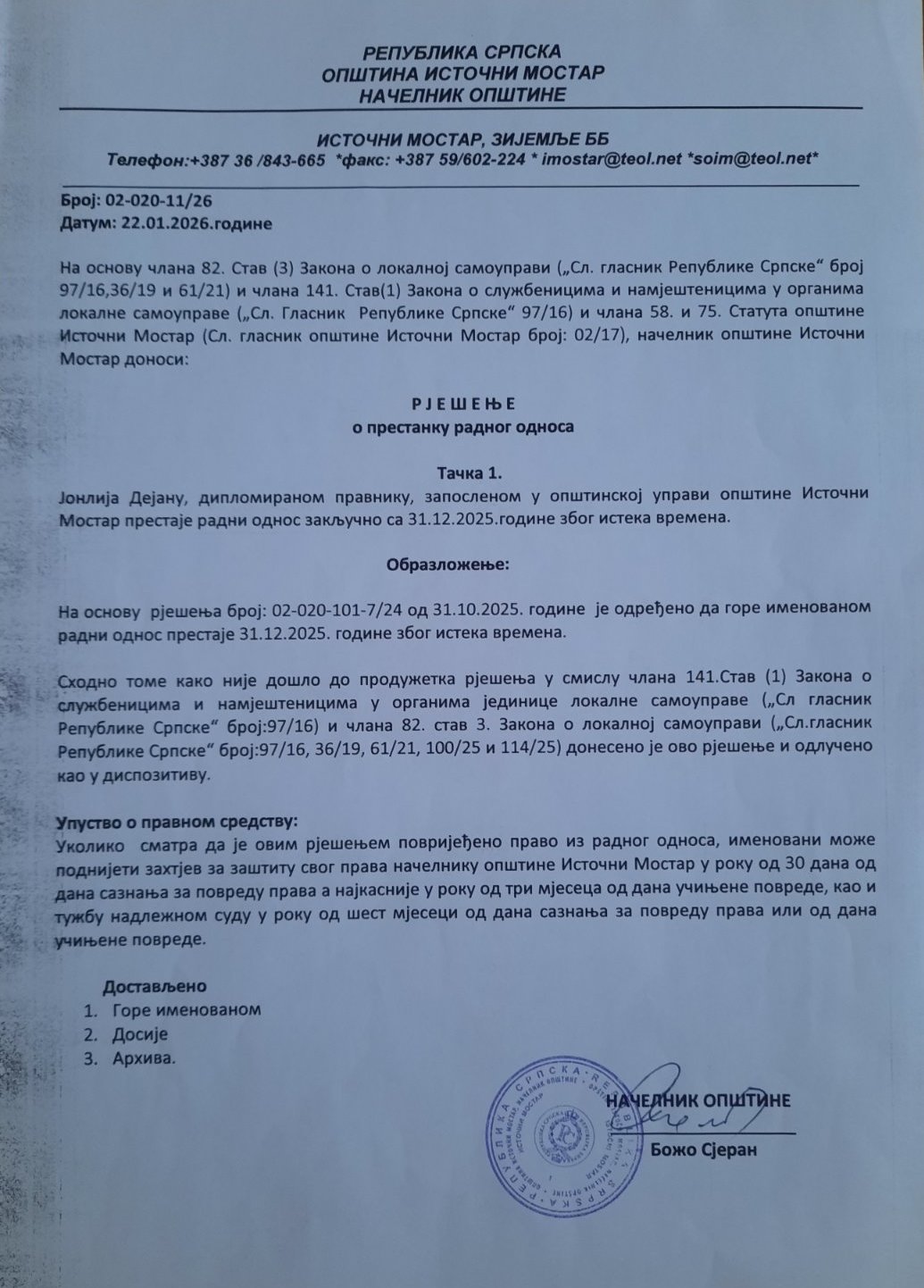 Umjesto čestitke za novu godinu Dejan Jonlija je od svog poslodavca dobio rješenje o prestanku radnog odnosa u opštini Istočni Mostar. Trenutno nezaposlen, ovaj mladi pravnik kaže da je to tačka na višemjesečni mobing, koji je nad njim vršio načelnik te opštine, Božo Sjeran, iz samo jednog razloga – političke nepodobnosti.