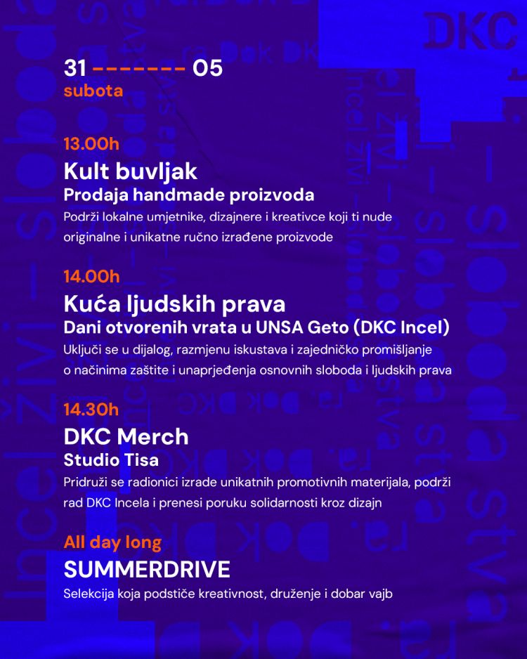 Program počinje u 13 časova s Kult buvljakom na otvorenom. Od 14 časova možete prisustvovati događaju “Dani otvorenih vrata Kuće ljudskih prava” na kojem će se predstaviti članice UNSA Geto i prostora DKC Incel. Već od 14:30 za sve kreativce kreće radionica pravljenja DKC merch-a za kampanju koju vodi “Studio Tisa”.