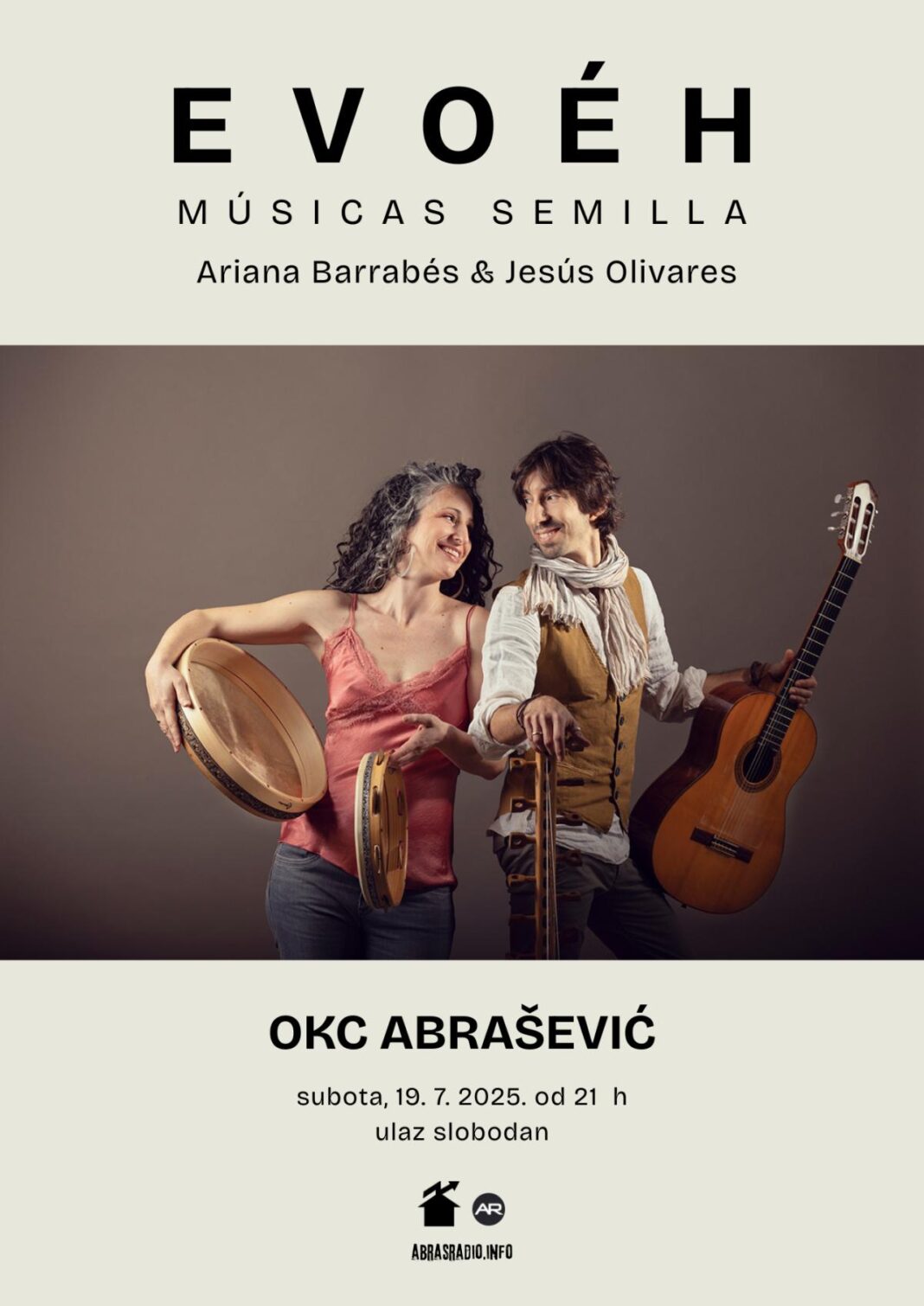 U okviru snimanja dokumentarnog filma “Searching for a Balkan Blues”, u kojem se istražuje univerzalni jezik muzike kroz susret sefardske tradicije i sevdaha, duo Ariana Barrabés (vokal, iberijska i bliskoistočna perkusija) i Jesús Olivares (gitara, lutnja, harfa, baglama i oud) donose koncertnu večer ispunjenu bogatstvom mediteranskih zvukova.