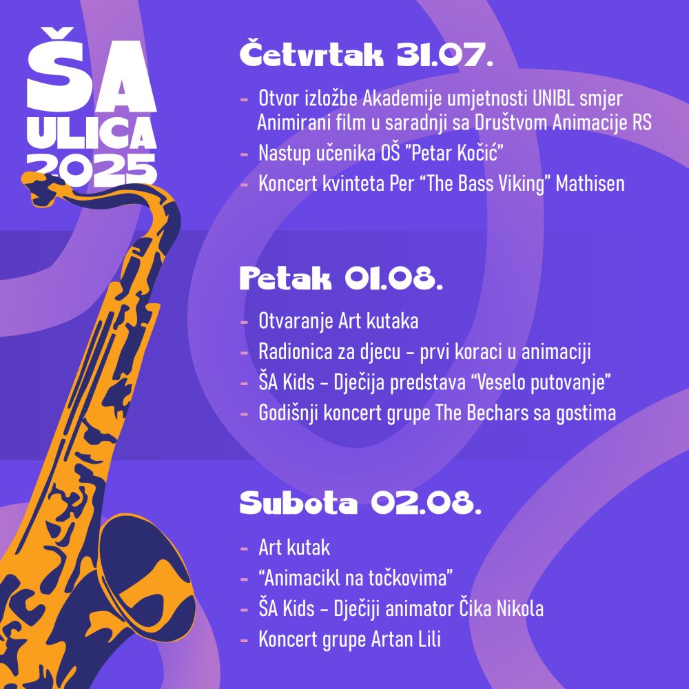 Gradska pješačka zona u Prijedoru, od 31. jula do 2. avgusta, pretvoriće se u “ŠA ulicu” – epicentar umjetnosti, muzike, zabave i naše prepoznatljivo dobre energije. U okviru bogatog programa, namijenjenog svim generacijama, posjetioci će imati priliku da uživaju u brojnim umjetničkim događajima gdje će se kroz muziku, slike i radost ispisivati nova poglavlja naše zajedničke priče.
