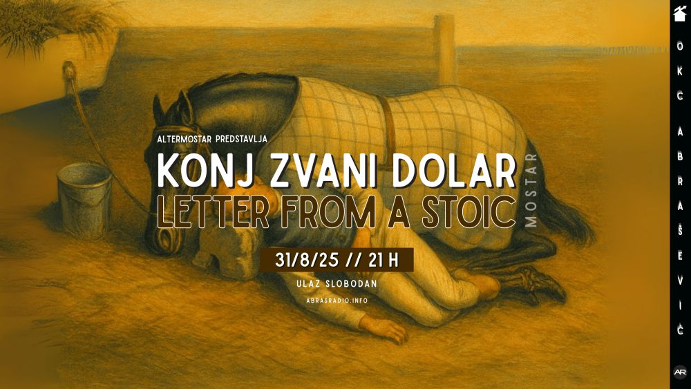 Letter from a Stoic je mostarski indie rock sastav koji se ističe melodičnim aranžmanima, introspektivnim tekstovima i atmosferičnim zvukom koji balansira između nostalgije i energije sadašnjeg trenutka. Njihove pjesme otvaraju prostor za kontemplaciju, dok istovremeno pulsiraju ritmom koji tjera na kretanje. Konj Zvani Dolar je novi eksperimentalni projekat iza kojeg stoje poznata imena lokalne scene. Ovu nedjelju će predstaviti svoj debi album, sirovu, nekonvencionalnu i stilski razbarušenu muzičku vožnju.