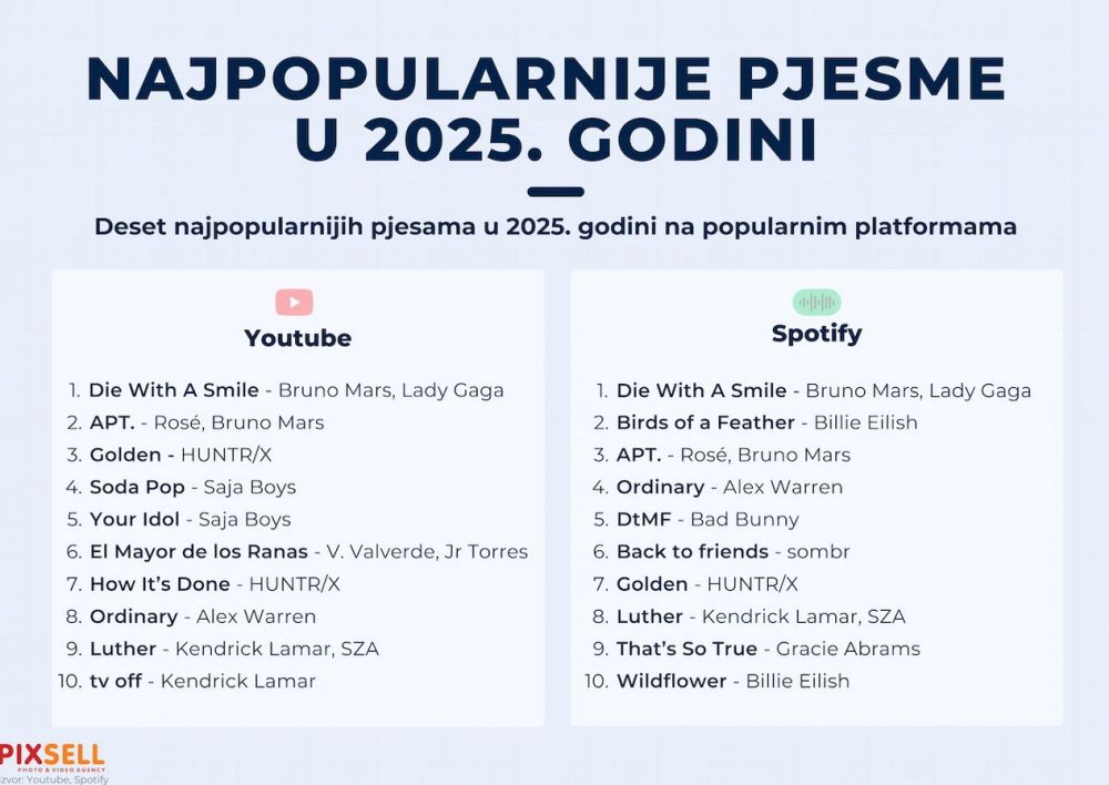 Na platformama YouTube i Spotify objavljene su liste deset najpopularnijih pjesama u 2025. godini, koje pokazuju da se muzički ukusi korisnika tih servisa djelomično preklapaju, ali i znatno razlikuju ovisno o platformi.