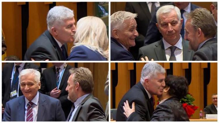 Na današnjoj sjednici bilo je prosto nemoguće upratiti sve delegate koji su se, vidno uzbuđeni zbog preuzimanja novih funkcije, grli i ljubili. Naš fotoreporter zabilježio je poljupce i zagrljaje Asima Sarajlića i Dušanke Majkić, Sredoja Novića i Zlatka Miletića, Bakira Izetbegovića i Dragana Čovića, Nikole Špirića i Lazara Prodanovića te Fahrudina Radončića i Dragana Čovića.