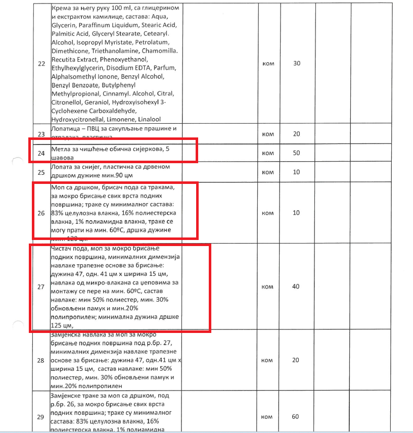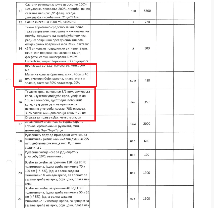 Primjera radi, magična krpa za brisanje poda, mora biti minimalnih dimenzija 40 x 40 cm, obavezno u četiri boje i to isključivo: crvena, plava, žuta i zelena. Precizno je naveden i sastav materijala krpe: 80% poliester, 20% poliamid. Truleks krpe moraju biti po tri u jednom pakovanju sastava: 70% visokoza, 30% pamuk. Ko nema da ponudi mop za brisanje poda dug tačno 47, a širok 15 cm, onda na tenderu nema šta ni da traži.