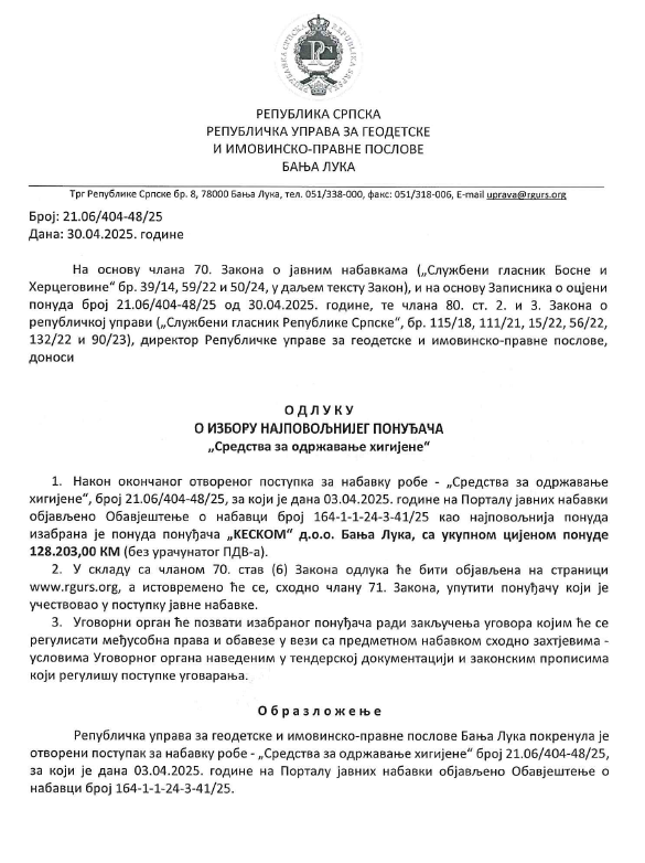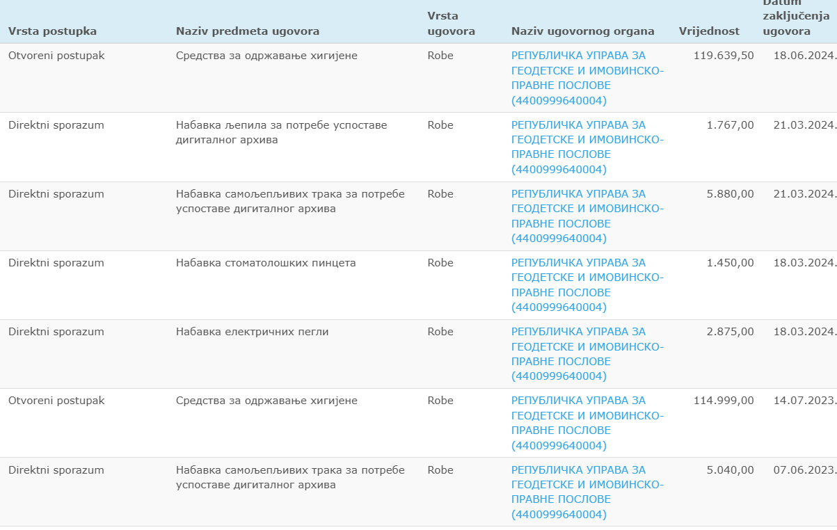 Republička uprava za geodetske i imovinsko-pravne poslove (RUGIP) će ove godine izdvojiti cca 150 000 maraka, za nabavku sredstava za održavanje higijene. Posao je kao i prethodnih godina dobila firma „Keckom“ iz Banjaluke, koja na RUGIP-ovim tenderima još od 2021. godine nema konkurencije.