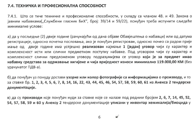 Primjera radi, prošle godine je od ponuđača traženo da su u protekle dvije godine realizovali najmanje jedan ugovor „čiji su karakter i kompleksnost isti ili slični predmetnom postupku nabavke“. Dalje se navodi da se podrazumijeva da vrijednost tog ugovora nije manja od 119 000 KM bez PDV-a. Inače, procijenjena vrijednost ugovora za nabavku higijenskih sredstava prošle godine iznosila je 119 658 KM.