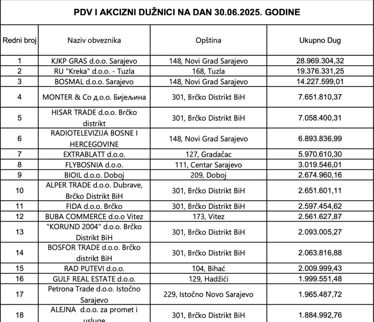 Prema posljednjem spisku PDV i akciznih dužnika, kojeg je aktuelizirala Uprava za indirektno oporezivanje BiH, na prvih 15 pozicija se nalazi čak 10 firmi s privatnim kapitalom. Pozicionirane su od 3. do 13. mjesta i ukupno duguju više od 50 miliona KM državi BiH, preciznije 50.506.612 KM.