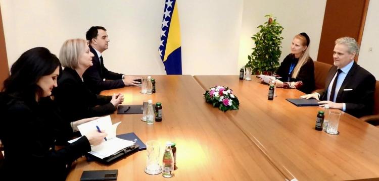 Predsjedavajuća Vijeća ministara Bosne i Hercegovine Borjana Krišto razgovarala je danas u Sarajevu sa šefom Delegacije Evropske unije u BiH i posebnim predstavnikom Evropske unije u BiH ambasadorom Johanom Satlerom (Johann Sattler) o prioritetima novog saziva Vijeća ministara BiH.