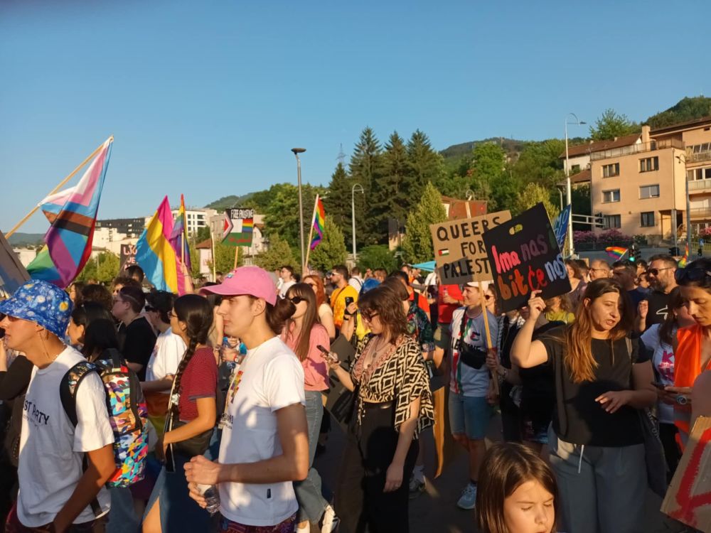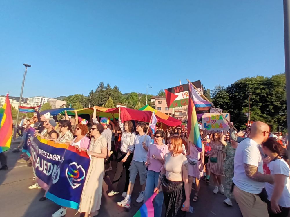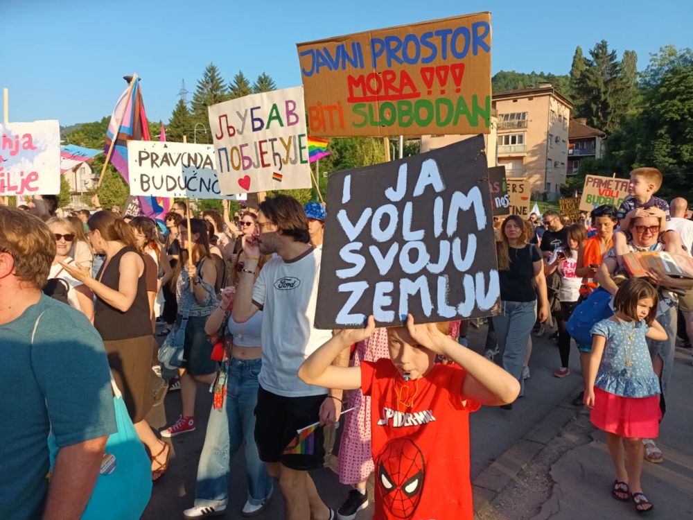 “Ne želimo da i dalje nemamo mogućnost sklapanja braka sa osobom koju volimo i da se svedemo na skrivanje partnera ili partnerke, pri čemu bilo kakav život koji zajedno gradimo nije prepoznat kroz sistem. Ne želimo da trans osobe ne mogu dobiti adekvatnu zdravstvenu podršku a naročito ne želimo da se rodni indentitet koji je teško ušao u zakone već briše iz njih. Želimo da institucije prepoznaju zbog čega izlazimo na ulice i šta je važno da se promijeni kako naši životi više ne bi bili na čekanju. Želimo zakone koji će zaštititi našu ljubav i naše postojanje i koji će omogućiti da ne budemo konstantno gurani na stranu kao da nismo dio ovog društva. Jer jesmo i bićemo. Ovdje smo zbog onih koji danas ne mogu šetati. Neki od njih su osobe koje najviše volite, koji žive potiskujući svoja osjećanja i gušeći ih. Na LGBTIQ+ osobe se stavlja veliki teret da se ne autuju, vjerujući da će svojom šutnjom zaštititi sebe i druge osobe u svom životu, žrtvujući sopstveni mir, blagostanje i autentičnost. Zato danas šaljemo ljubav na mjesta gdje se riječ gej, lezbejka, biseksualna, trans ili kvir osoba ne govore. Ponosno stojimo ovdje a ne u svoja četiri zida“, kazala je Kravljača.