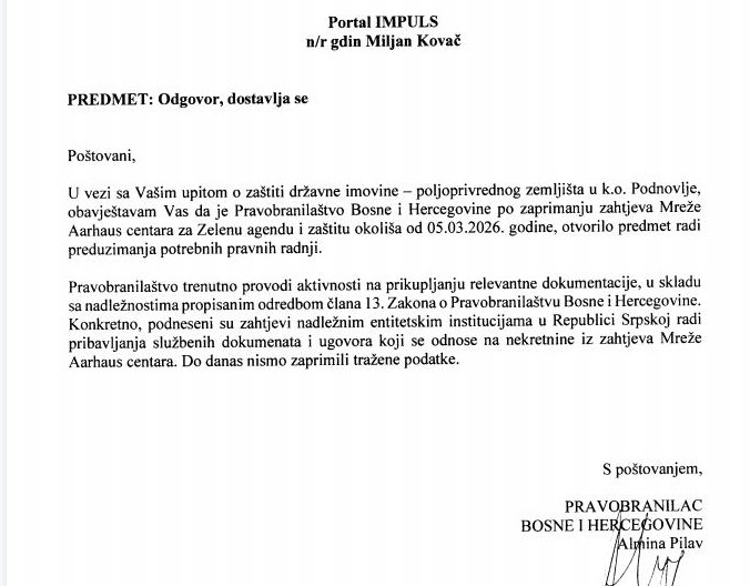 “Trenutno se provode aktivnosti na prikupljanju relevantne dokumentacije. Iz Pravobranilaštva navode da postupaju u skladu sa Zakonom o Pravobranilaštvu Bosne i Hercegovine, koji definiše njihove nadležnosti u ovakvim slučajevima”, potvrđeno je Impulsu iz Pravobranilaštva BiH.