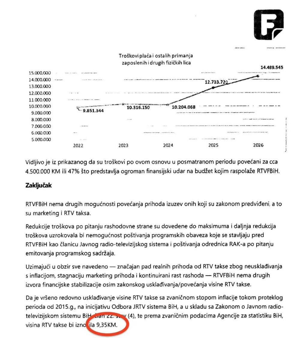 Tako je u obimnoj dokumentaciji izračun iznos prihoda za postojeću visinu RTV takse od 7,50 KM kao i uz povećanje na 10 KM.