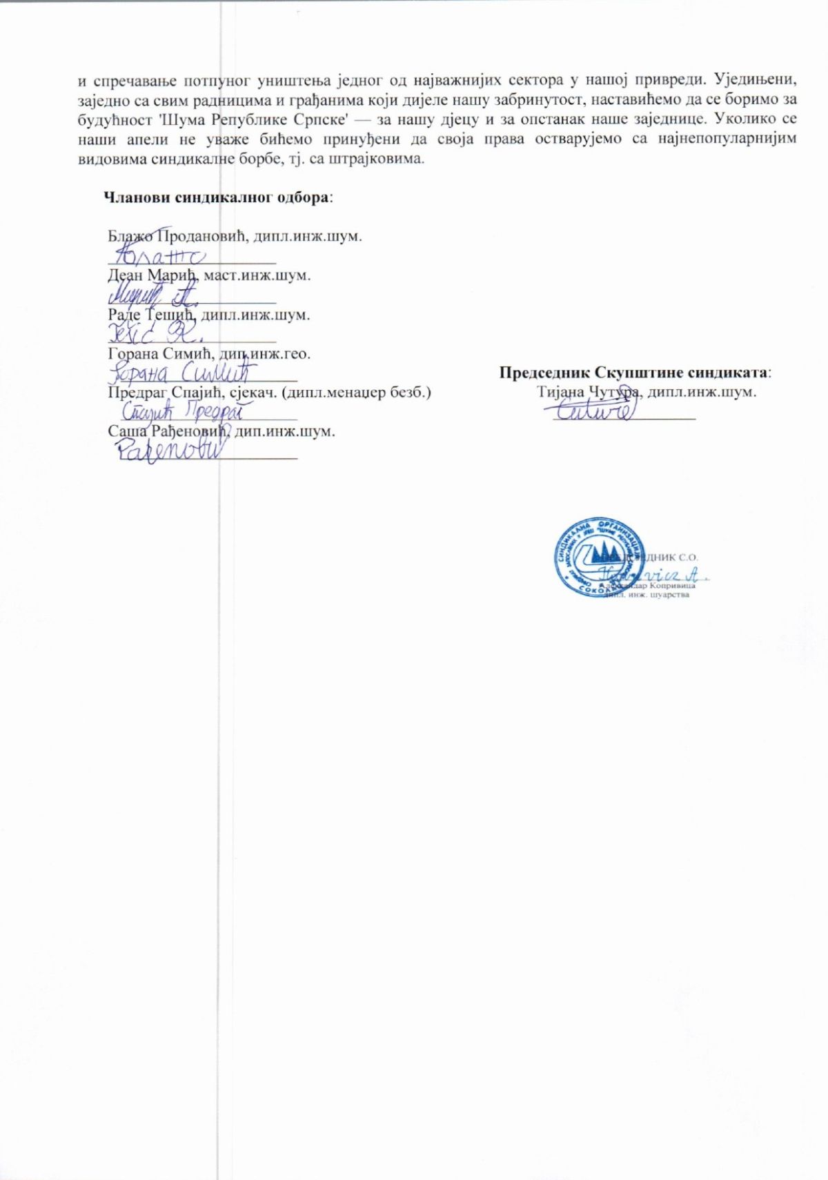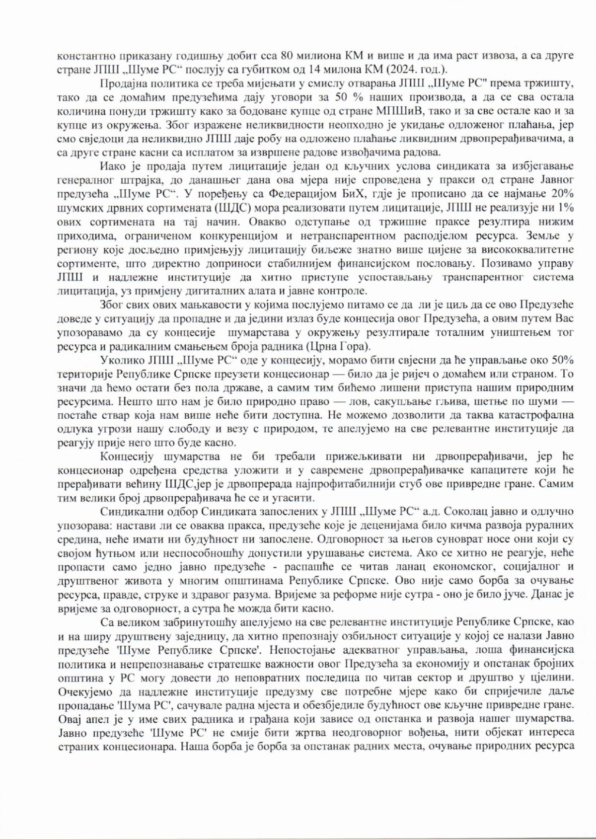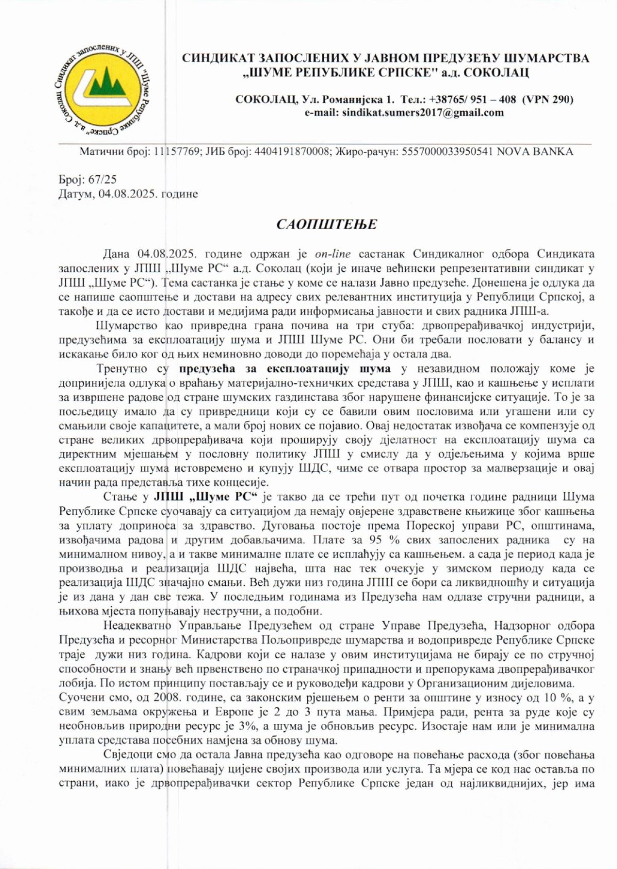 Sindikalni odbor Sindikata zaposlenih u JPŠ „Šume RS“ a.d. Sokolac javno i odlučno upozorava: nastavi li se ovakva praksa, preduzeće koje je decenijama bilo kičma razvoja ruralnih sredina, neće imati ni budućnost ni zaposlene. Odgovornost za njegov sunovrat nose oni koji su svojom ćutnjom ili nesposobnošću dopustili urušavanje sistema.