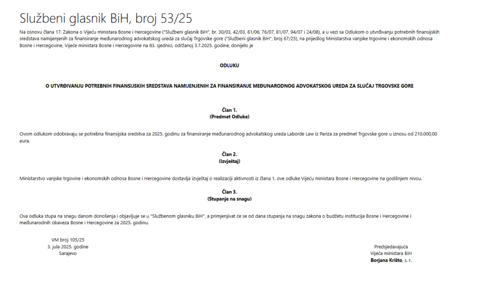 Ovom odlukom odobravaju se potrebna finansijska sredstva za 2025. godinu za finansiranje advokatskog ureda “Laborde Law” iz Pariza u iznosu od 210.000 KM.