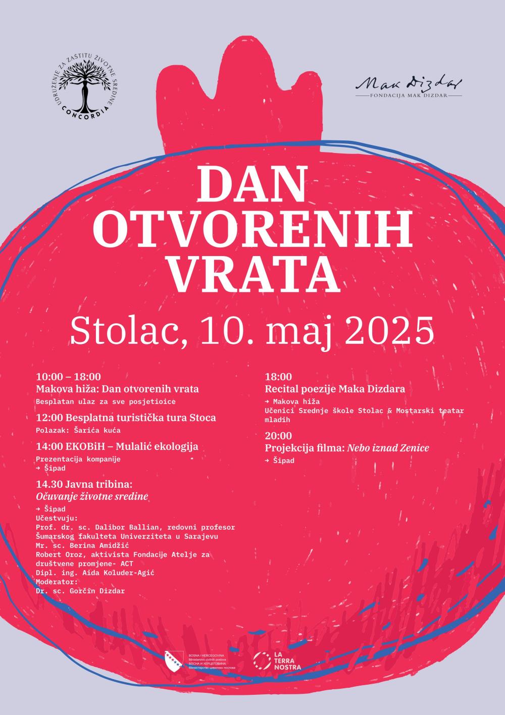 Fondacija Mak Dizdar i Udruženje za zaštitu životne sredine „Concordia“ pozivaju građane i posjetitelje na Dan otvorenih vrata, koji će se održati u subotu, 10. maja 2025. godine u Stocu. Ova cjelodnevna manifestacija spaja kulturnu baštinu, ekološku svijest i zajednički doživljaj grada kroz raznovrstan i pristupačan program.