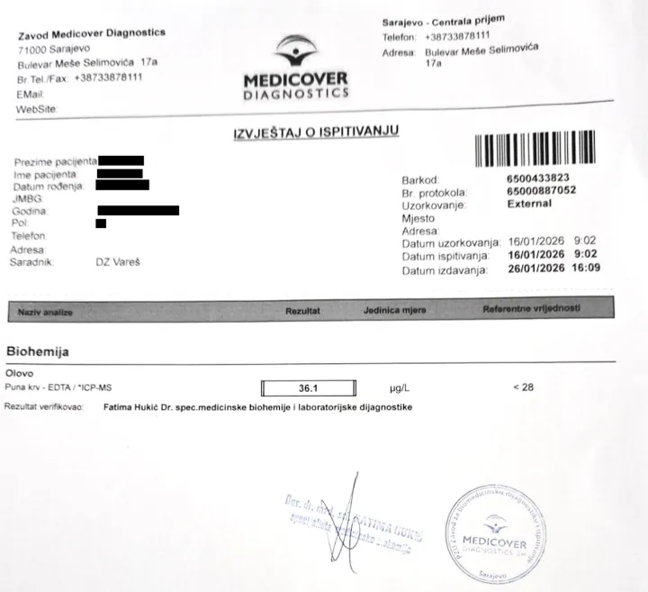 Podsjećamo da su prethodna ispitivanja, provedena u decembru prošle godine, pokazala da je kod svih 44 testirane osobe, različitih starosnih skupina, zabilježeno prisustvo olova u krvi, a kod njih 17 iznad granične vrijednosti. U međuvremenu je, u privatnom aranžmanu, testirano još devet osoba, a njihovi nalazi samo su potvrdili alarmantne pokazatelje. Posebno zabrinjava činjenica da je olovo pronađeno i u nalazima petoro djece mlađe od šest godina.
