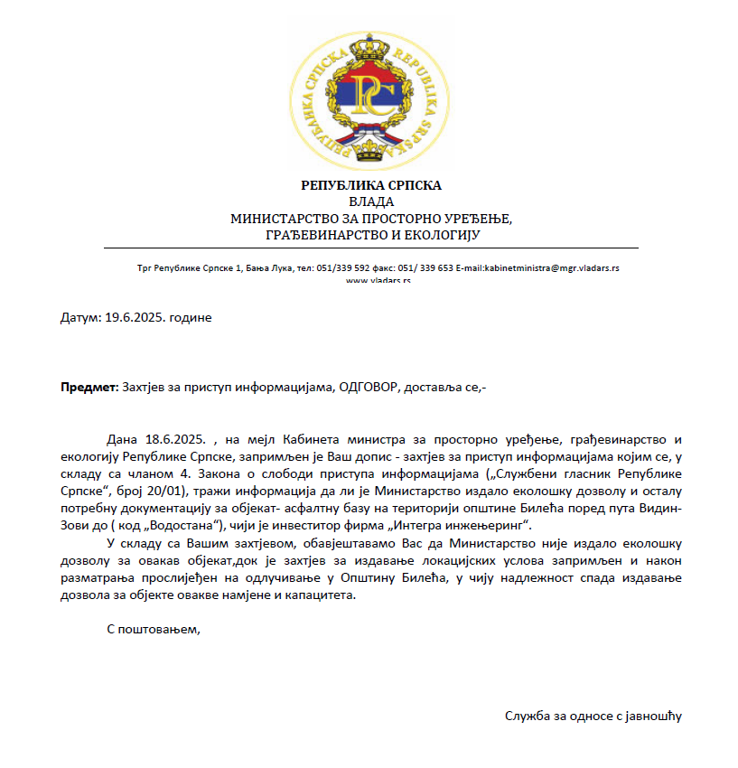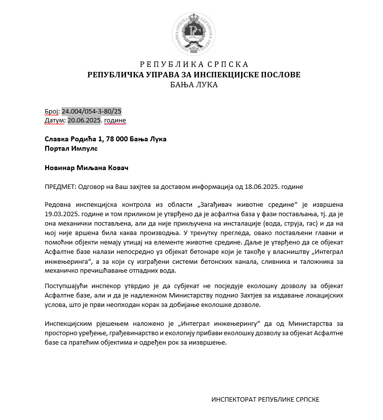 U odgovoru se dalje navodi i da je inspekcijskim rješenjem naloženo “Integral inženjeringu” da od Ministarstva pribavi ekološku dozvolu za objekat Asfaltne baze sa pratećim objektima i određen rok za izvršenje.