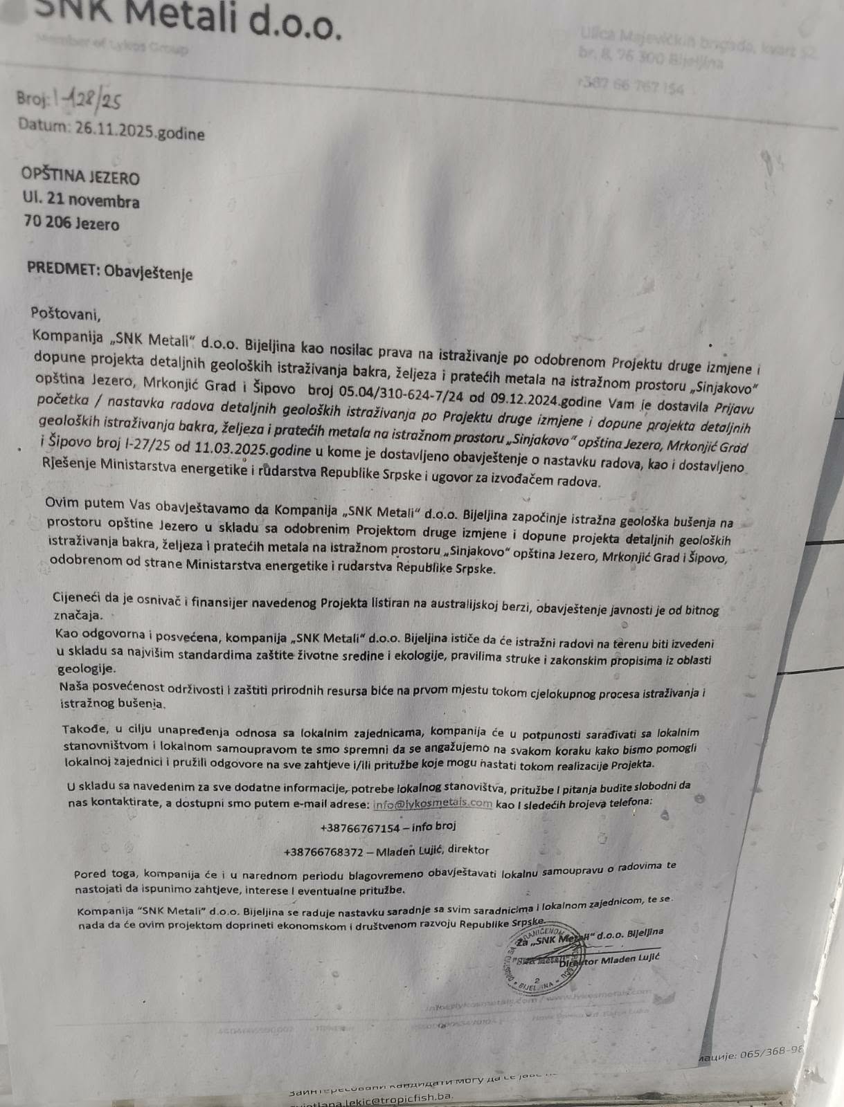 Kompanija SNK Metali d.o.o. Bijeljina, koja vrši geološka istraživanja u opštini Jezero, danas je u prostorijama Opštine održala sastanak sa mještanima o geološkim istraživanjima. Okupljenim mještanima, aktivistima i ekolozima je zabranjeno da prisustvuju sastanku ako nemaju ličnu kartu opštine Jezero.