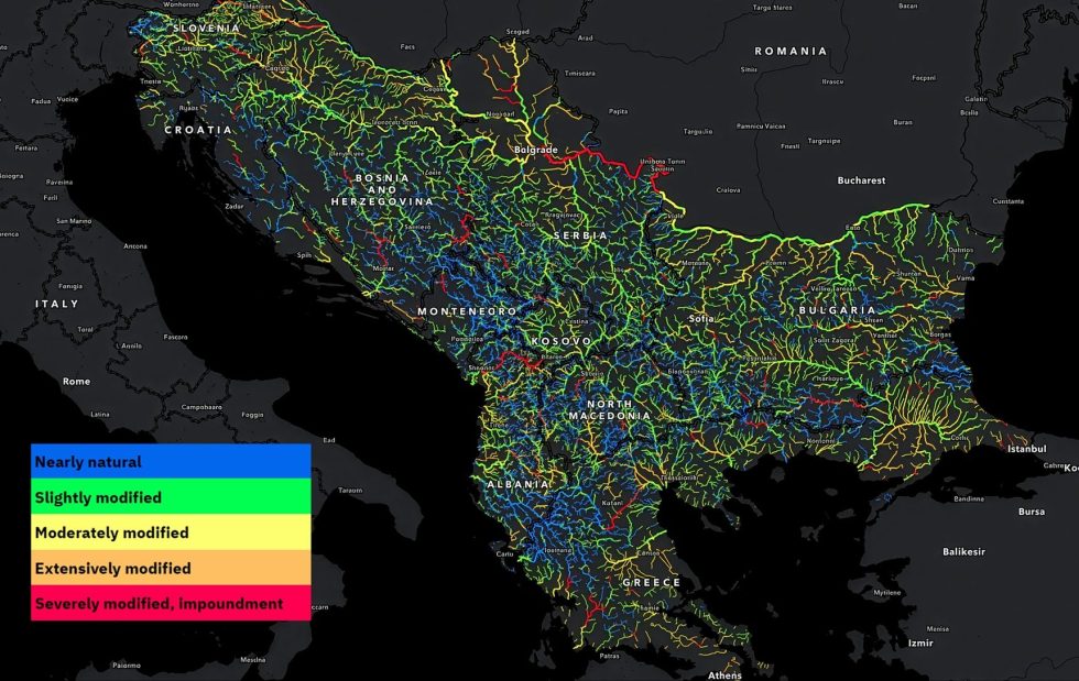 Od analiziranih većih rijeka, samo 23% i dalje je gotovo prirodno, dok 43% pokazuje blage izmjene. Umjereno do snažno izmijenjene rijeke čine 27%, a teško izmijenjene dionice – prvenstveno akumulacije – 7% mreže. Najznačajnije promjene zabilježene su u slivovima Drine, Neretve, Vardara/Axiosa, Devolla i Drima. Iako je ovaj pad alarmantan, preostali udio gotovo prirodnih i blago izmijenjenih rijeka i dalje je znatno veći nego u ostatku Evrope, što potvrđuje jedinstveni status Balkana kao posljednjeg velikog evropskog uporišta netaknutih rijeka.