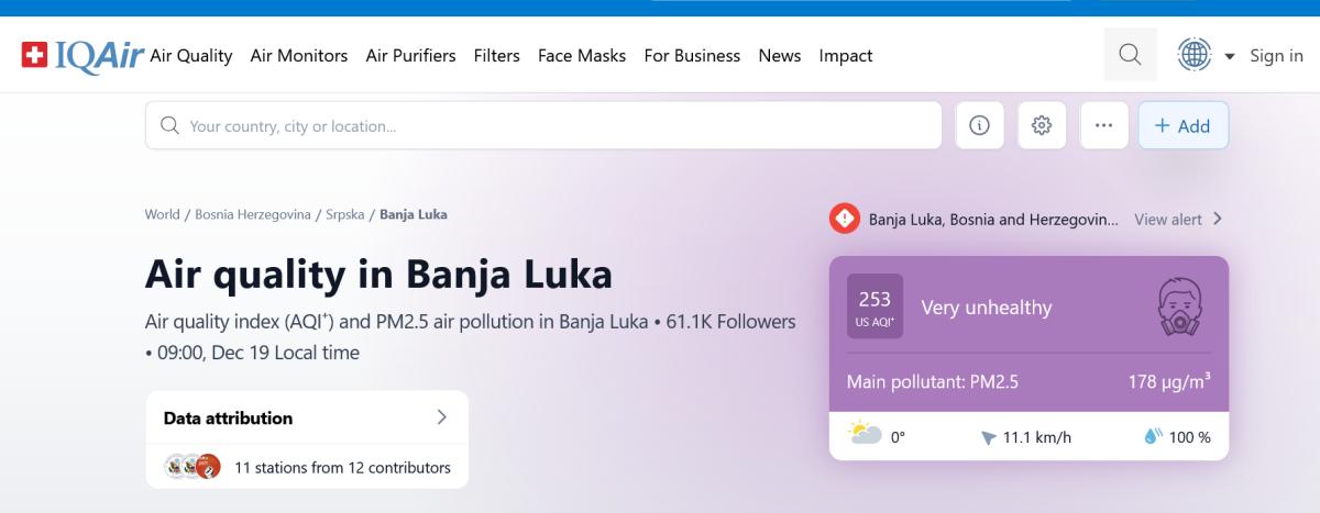 Kvalitet vazduha danas, 19 decembra u Banjaluci, ponovo je opasan po zdravlje. Prema podacima IQ Air quality jutros u devet časova indeks kvaliteta vazduha je 253, odnosno 178 mikrograma po metru kubnom (µg/m³) lebdećih čestica.